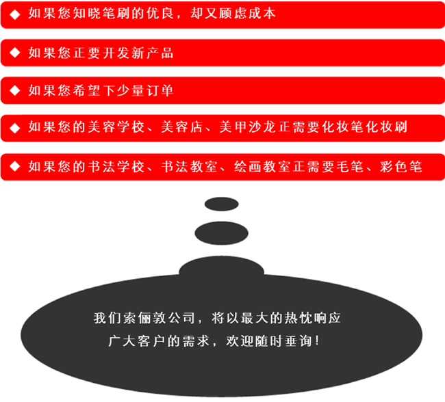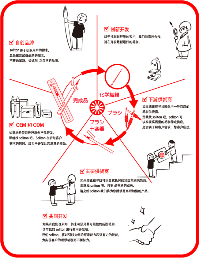 本公司在秉承着奈良传统制笔技艺的同时 创先引入PBT化学纤维,用于毛笔、眼线笔、眉笔的制造 至今已累计销售笔刷2亿多支 在“日本制,质优价廉”的口号下,反复琢磨改善笔的制作 探索新的可能性,寻找性能更加优良,更加理想的笔刷制作方法 每一天都在刷新自己 目标是成为世界第一的笔刷制造商 作为笔刷的专业制造商 从每一根纤维的开发研究开始,到终产品的提供 笔刷产品的制造工序全都严格按照客户的要求,向客户提供高水平的产品
